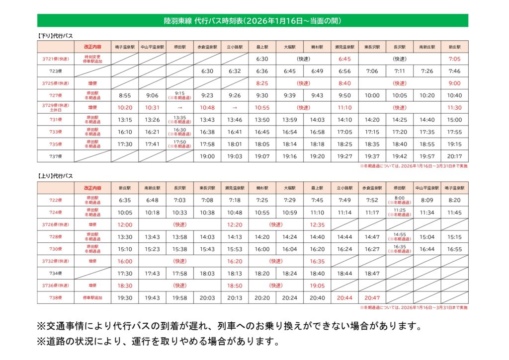 📢陸羽東線(鳴子温泉~新庄)代行バスの時刻改定について(2026年1月16日~当面の間)