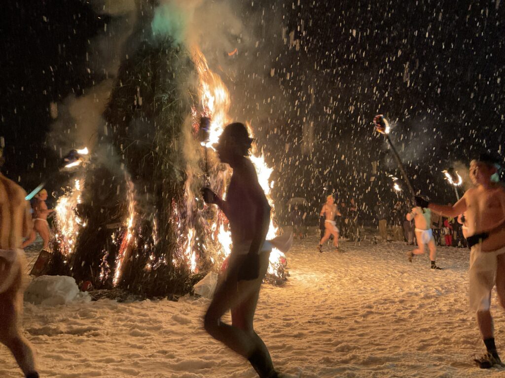 毎年、厳冬の中下帯1枚の男衆が松明を片手に雄叫びを上げながら、家内安全と商売繁盛を祈願するため、赤倉地区を駆け巡ります。